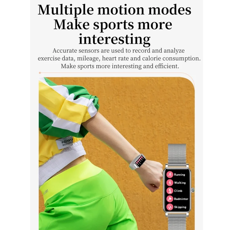 15. Functions: heart rate detection, blood oxygen detection, blood pressure detection, female menstrual period, time display, step counting, calories, distance, heart rate, sleep time, switch display, 12 sports modes (running/walking/hiking/badminton/ Rope skipping / exercise / yoga / aerobics / spinning / elliptical machine / rowing machine / swing), sleep monitoring (sleep time, sleep quality), call notification, information reminder, multi-language push, alarm clock reminder, sedentary reminder, etc.