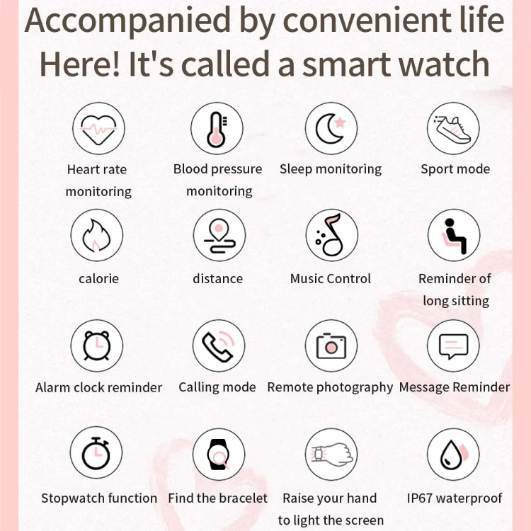 1. Functions: master control 8763E, call, music, electricity reminder push, SMS reminder push, WeChat reminder push, QQ reminder push, exercise record (step counting, mileage, etc.), sleep monitoring, sedentary reminder, calorie counting, stopwatch, Raise your hand to brighten the screen, dynamic heart rate, blood pressure, vibration, more than 100 sports modes, 10 sets of themes, remote camera, music control, smart alarm, weather forecast, multi-dial switching, WeChat sports, female menstrual cycle.