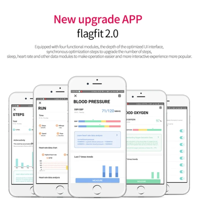4. Health monitoring: Dynamic and static blood pressure, dynamic and static blood oxygen, dynamic and static heart rate, fatigue monitoring, sleep monitoring, step countmonitoring, calorie consumption, distance, sedentary reminder.
