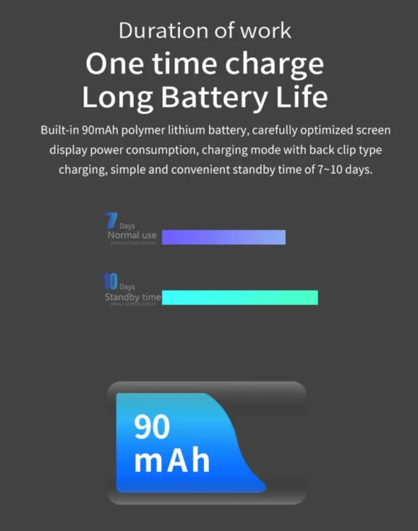 7. 90mAh polymer lithium battery, standby for about 7 days.