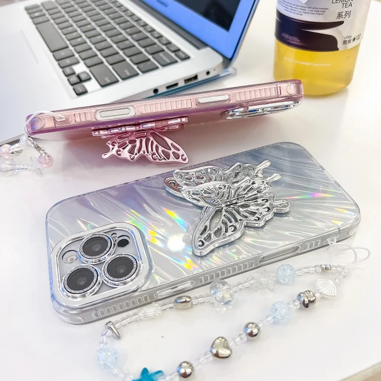 Plating Glitter Lens Film Texture Butterfly Holder Wristband Phone Case, For iPhone 13