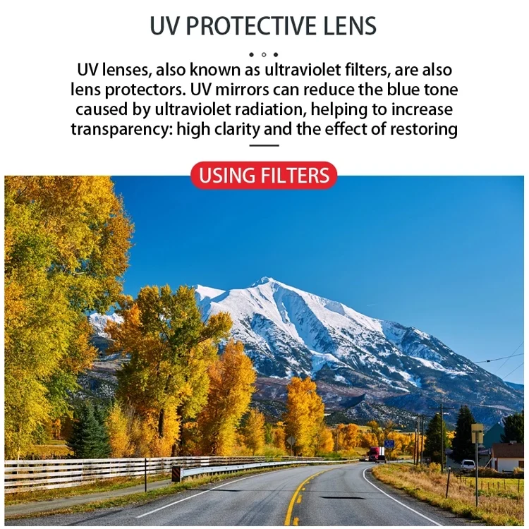 1. UV filter: Suitable for shooting in the seaside, mountains, snowfields and open areas, etc. It can reduce the blue tone caused by ultraviolet rays. At the same time, for the camera, it can also eliminate the interference of ultraviolet rays on the CCD, which helps to improve the effect of sharpness and color reproduction.