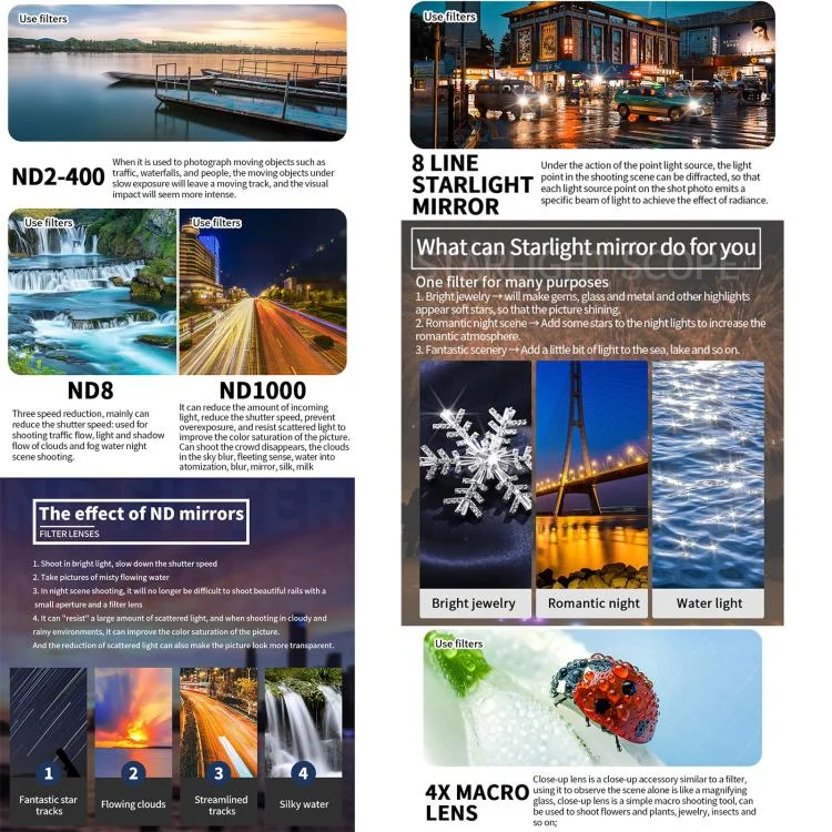4x Macro Lens ,8-line Star ,CPL ,GND Gradient Grey ,ND2-400 Adjustable ,ND8 ,ND1000 ,UV ,Black Mist 1/4 ,Black Mist 1/8 ,Gradient Pink ,Gradient Blue ,Streak Drawing Glod ,Streak Drawing Blue ,White Mist Filter NO.3 ,NIGHT |
