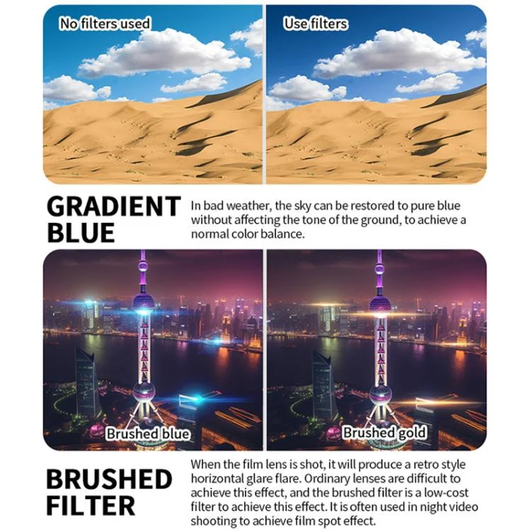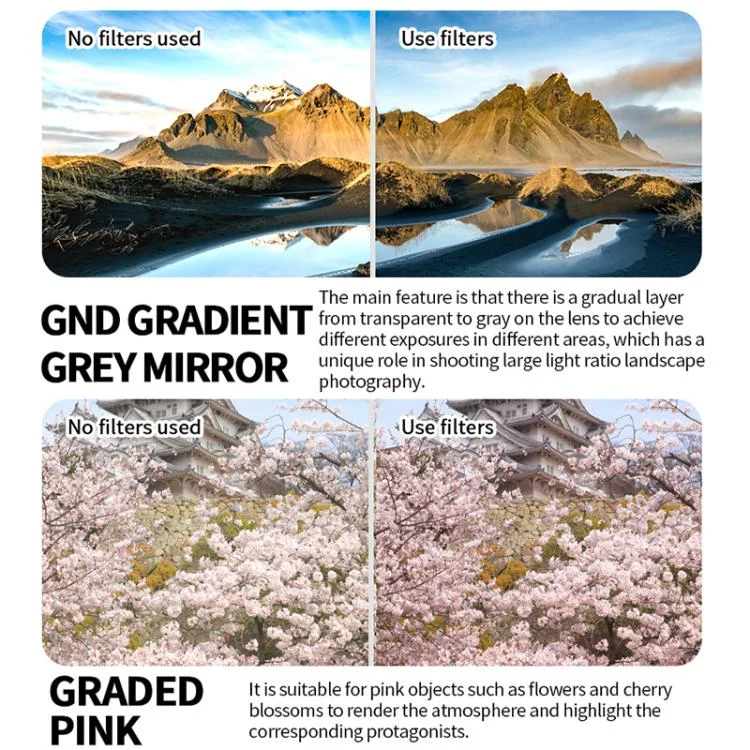 3. ND Filter: You can get more freedom to control aperture and shutter, bring more exposure methods and creative space for photography creation, and effectively prevent overexposure. The number behind ND represents the ability of the ND mirror to block light.