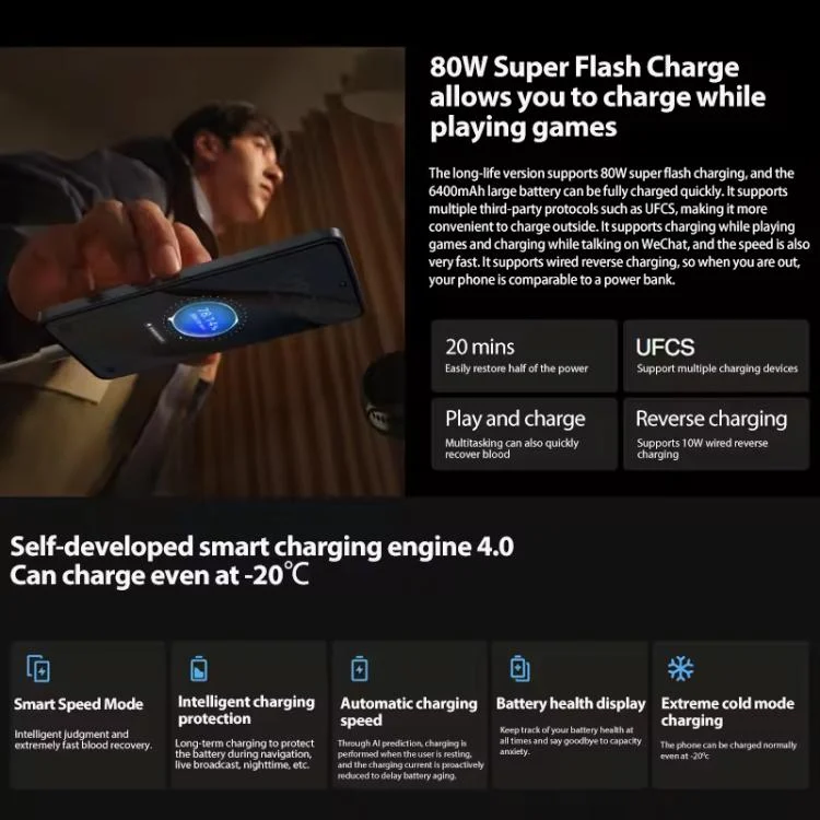 2. Power: 80W Super Flash Charge. Compatible with 67W / 50W / 33W Super Flash Charge, 33W UFCS Fusion Fast Charge, 13.5W PD
