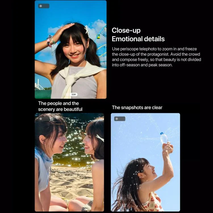 1. Rear: Rear: 50MP wide (f1.8, 24mm, 6P lens, AF, OIS) + 50MP ultra-wide (f2.0, 16mm, 5P lens, AF, 116 degree) + 50MP telephoto (f2.8, 80mm, 4P lens, AF, OIS)