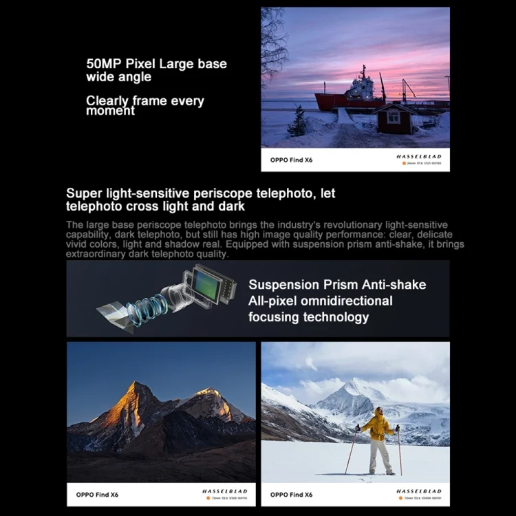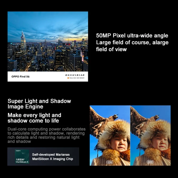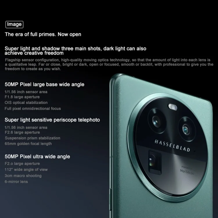 3. 50MP triple back camera: 50MP IMX989 camera(f/1.8, 84 degrees FOV) + 50MP periscope telephoto lens (F/2.6, 36 degrees FOV) + 50MP ultra wide angle (f/2, 112 degrees FOV). 32MP UHD front camera (f/2.4, 90 degrees FOV, auto-focus). Hasu mobile photography system, MariSilicon X independent image chip, to restore natural colors