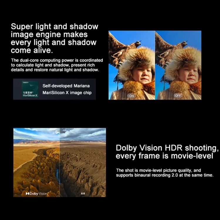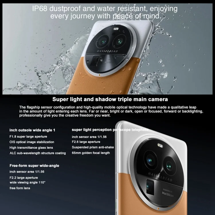 3. 50MP triple back camera: 50MP IMX989 camera(1/1 CMOS, f/1.8, 86 degrees FOV) + 50MP periscope telephoto lens (1/1.56 CMOS, F/2.6, 36 degrees FOV) + 50MP ultra wide angle (1/1.56 CMOS, f/2, 112 degrees FOV). 32MP UHD front camera (f/2.4, 90 degrees FOV, auto-focus). Hasu mobile photography system, MariSilicon X independent image chip, to restore natural colors