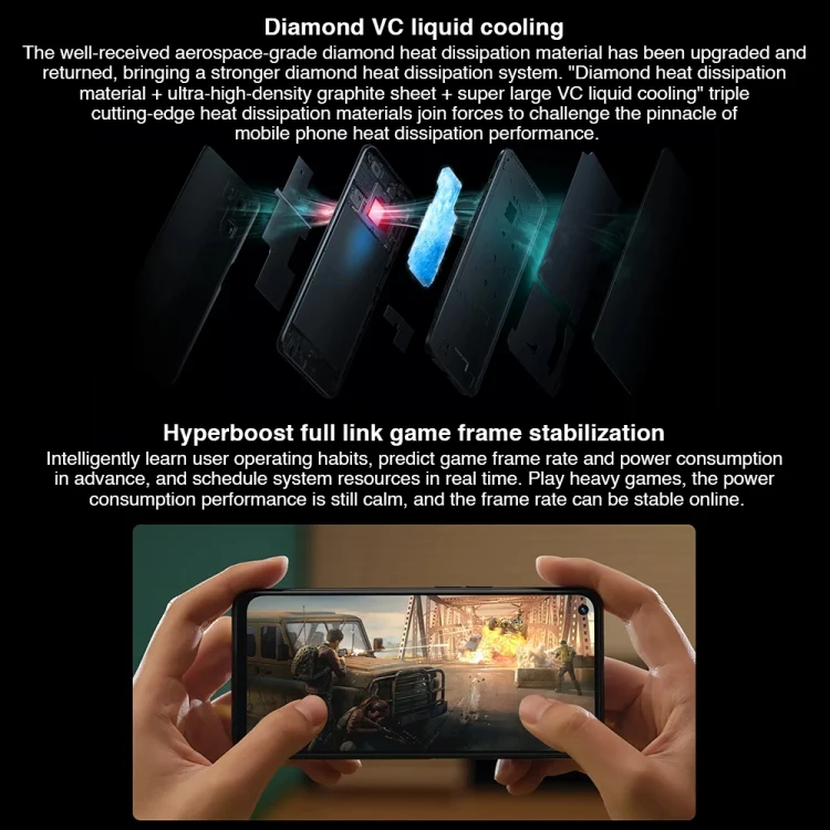 8. Vajrayana VC liquid cooling system, X-axis motor, closed 3D dual speakers, providing better mobile game experience.
