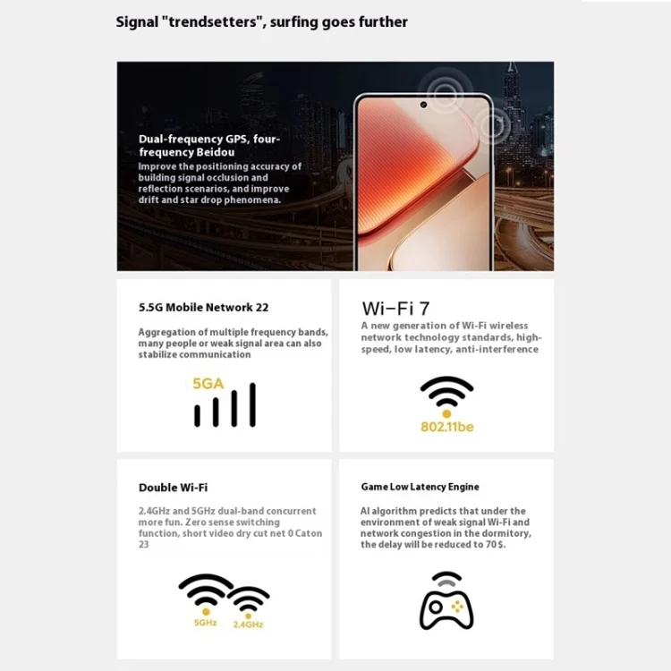 3. Navigation: Support GPS: L1+L5, Beidou: B1C+B1I+B2a+B2b, GLONASS: G1, Galileo: E1+E5a+E5b, QZSS: L1+L5, NavIC: L5; Support AGPS, cellular network positioning, wireless LAN positioning