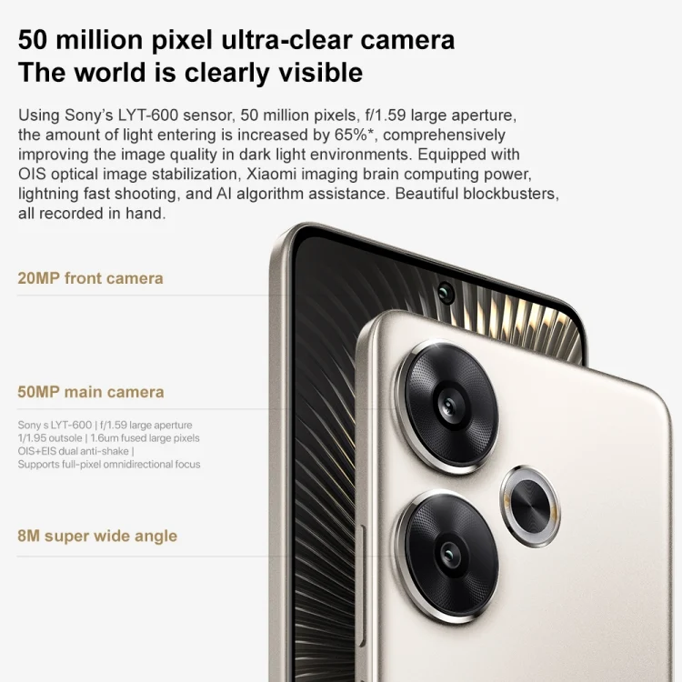 1. Rear camera: 50MP flash Snap camera (LYT-600, F1.59 large aperture, 1/1.95, OIS + EIS dual image stabilization) + 8MP